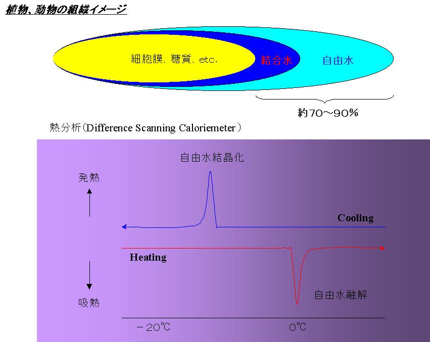 水にも色々あって、ただの水?!の他に結合水(組織水?)という特殊な水があります! 普通、冷凍庫くらいの温度(−20℃)になると自由水というものは凍ってしまいます。 でも、結合水は凍らない・・・ 細胞膜のリン脂質とか、糖質の官能基(OH)の近くに居る水分子は、水素結合で官能基と 結合していて、運動性が低下してるためだと言われてます!? 面白いですよね〜(面白くないか?) どれくらいの割合で結合水があるかは、熱分析で調べられるんですけどね! ジャム、シロップ類はほとんどが結合水でしょう? 自由水が少ないと、カビが生えたり腐ったりせずに長持ちします。 昔の人は経験的にそういうことを利用してるんでしょう?(感心!!) 魚とか肉、野菜を冷凍すると、美味しくなくなったり、ボソボソするのは自由水の結晶が 成長して組織を壊してしまうからです! マグロとか牛肉みたいな大きなものは、どうしても冷却スピードが遅くなるもんね・・・ 自由水は、一度結晶化しても、温度のゆらぎなんかで成長するみたいです。 最近は、冷凍技術も進歩して、そういうことは少なくなってるみたいだけど・・・ 誘電CASフリーザーというものがすでに市販されてるみたいです。 通常は表面から凍結してしまうものを、マイクロ波で、自由水の運動性を上げるようにして、 過冷却を高めて、−20℃で一気に全体を結晶化させるというもの! 世の中には、頭のいい人がいるもんです!![]()